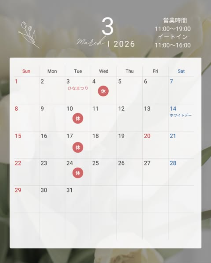 OPEN 11:00~19:00 定休日 火曜日